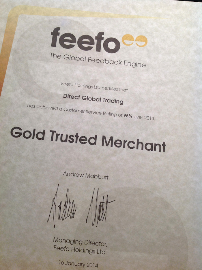 After a very successful 2013, we are today delighted to announce that we, Direct Global Trading Ltd have been awarded a certificate of achievement from the online reviewing giants Feefo. Thanks to our exceptional customer service and you our customers overall satisfaction we have been awarded a certificate to show a consistent 95% customer satisfaction rate for 2013.